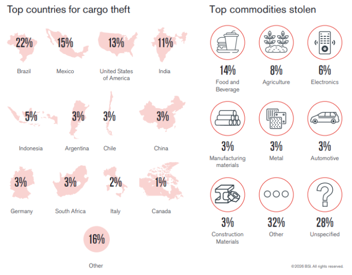 Brazil, Mexico, India, the US, Indonesia, Chile, China, Germany, and South Africa were the top countries for recorded cargo theft, according to TT Club and BSI Consulting. The 2025 Cargo Theft Report, published on 21 April, said that Ecuador experienced one of the sharpest increases of any nation, with theft cases nearly doubling as gang-related violence intensified in coastal provinces. Food and beverage products led all stolen commodity categories, followed by agriculture, electronics, automotive parts, construction materials, and metals.