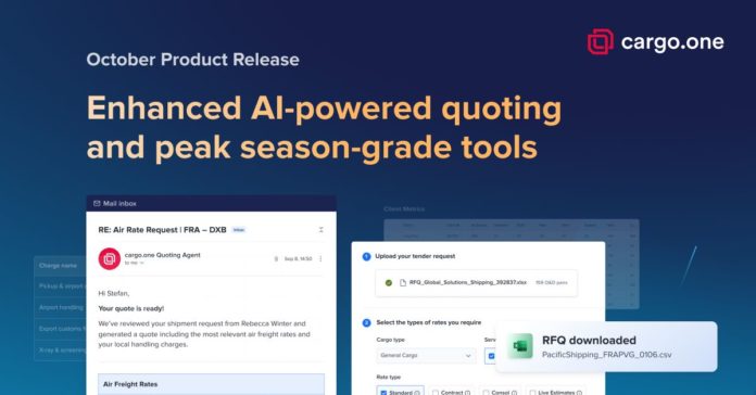 Enhancements in the latest release of the Cargo.one technology platform for forwarders include enhanced AI-powered quoting, multi-lane tender rate procurement, a single source of truth for all rates, customer-specific pricing rules, and real-time quoting analytics.