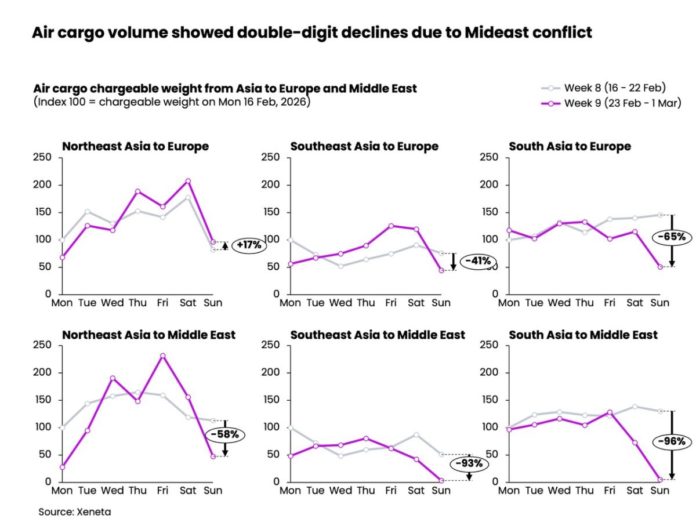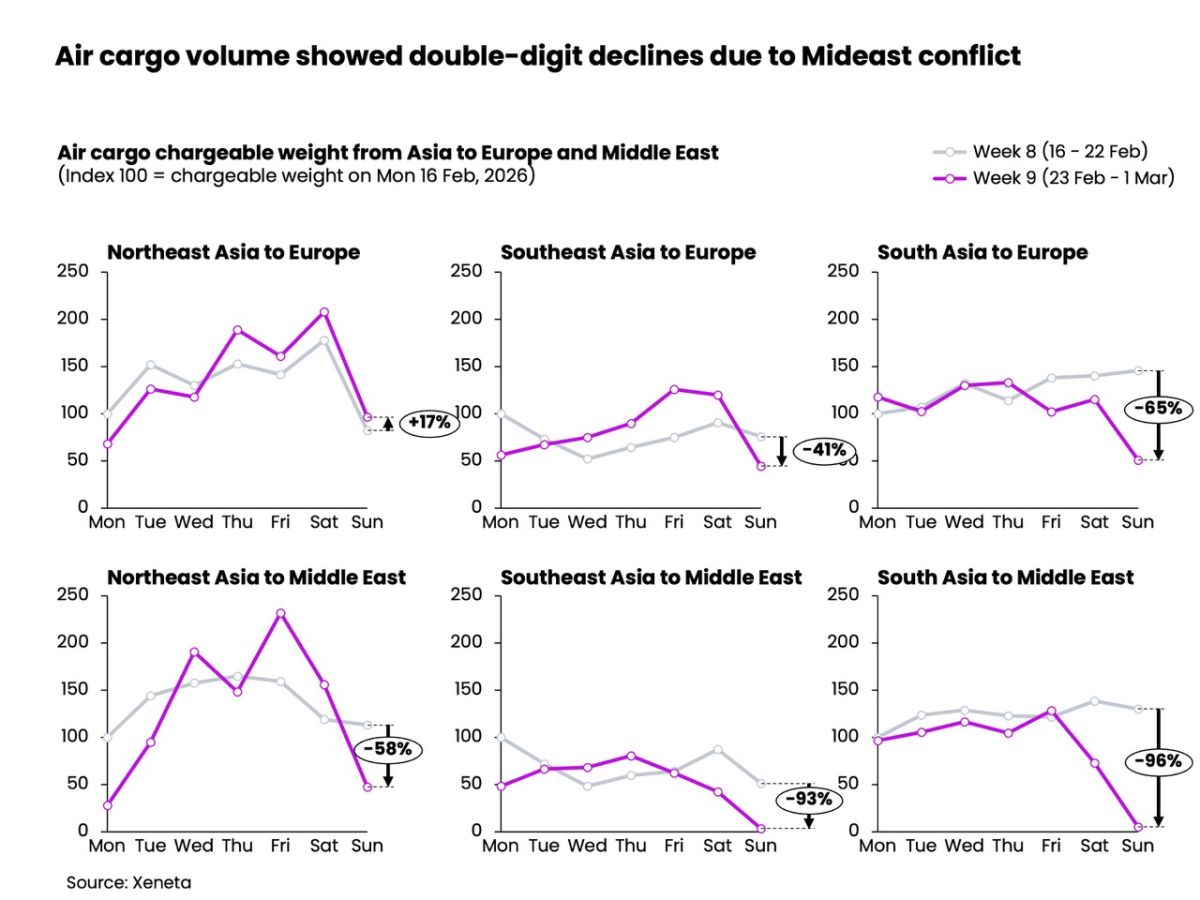 Major regional hubs – such as Doha, Dubai, and Abu Dhabi – temporarily suspended flight operations amid multiple airspace restrictions, causing an immediate impact on the Asia–Europe air cargo corridor. The revenue impact of disrupted flight timetables is just one of the concerns for airlines. Jet fuel, a major airline cost component, could also rise materially if crude prices continue to climb. Industry analysts already report Brent crude oil prices above $80 per barrel, and these could potentially exceed $100 if oil production infrastructure is targeted due to tensions in the region.